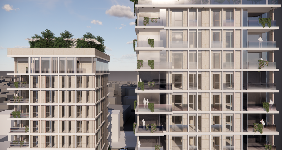 תכנית לפינוי 3 מבני מגורים קיימים והקמת 2 מבני מגורים חדשים בני 10-31 קומות, בתוספת חזית מסחרית וגני ילדים.